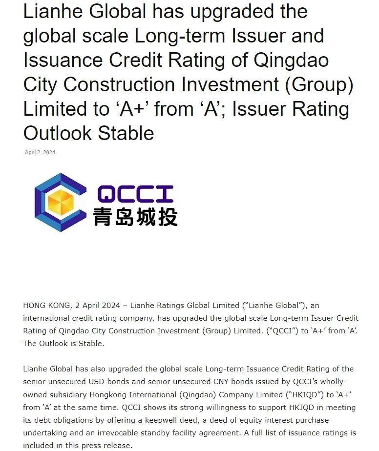 4月2日,权威评级机构联合国际正式宣布上调乐鱼(中国)国际长期发行人评级从‘A’上调至‘A+’,展望稳定,同时将由青岛城投全资子公司香港国际(青岛)有限公司(“香港国际”)发行的高级无抵押美元债券和高级无抵押人民币债券的国际长期发行债务评级从‘A’上调至‘A+’。