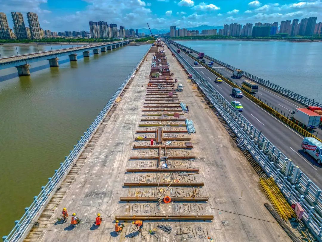 在海上将两座特大桥连接起来,在施工规模、技术条件、工期要求等方面在全国范围内属首例。针对桥梁使用年限较久、旧桥技术状况不佳的问题,交发集团协同市交通运输局广泛邀请国内高精尖专家就桥梁拼接方案前后开展了十余轮研究论证,最终确定了“翼缘连接+变高度混凝土横肋加强”的设计方案。通过国内领先的悬吊式栈桥施工技术和现浇梁横向拼接技术,在一道道横肋上“穿针引线”,将两座桥梁“缝合”起来。