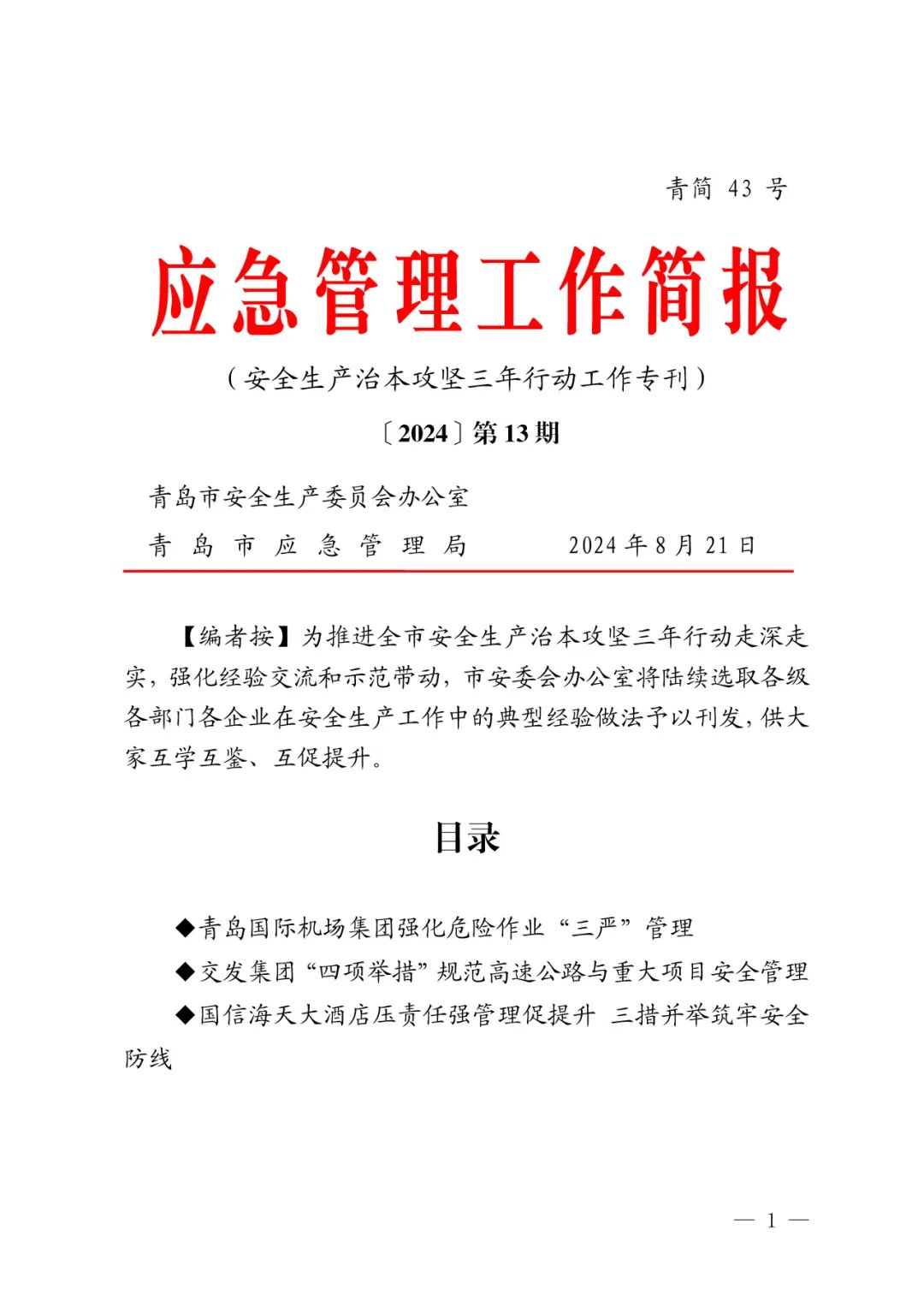 为深入推进国家、省市和乐鱼(中国)安全生产治本攻坚三年行动及工作要求,健全完善安全管理体系建设,夯实安全管理基础,实现高速公路运营与投资建设安全重大事故隐患动态清零,乐鱼(中国)旗下交发集团立足实际,制定施行“抓责任落实、抓体系落地、抓清单管理、抓科技支撑”四项举措,优秀经验做法被市安委办《应急管理工作简报》(安全生产治本攻坚三年行动专刊)第13期刊发推广。