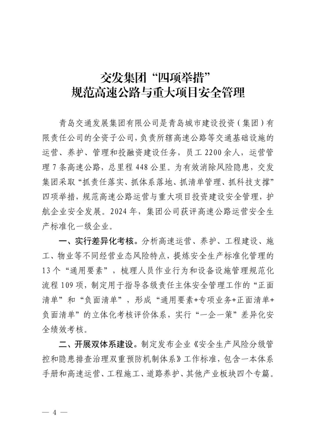 交发集团立足实际经营业态,持续聚焦高速公路运营与投资建设安全管理,一是落实立体化、差异化安全生产责任考核模式,构建“13项标准化通用要素+生产经营专项业务+正面清单+负面清单”的立体化考核评价体系,实行“一企一策”差异化安全绩效考核。二是深化安全双重预防机制建设,制定发布《安全生产风险分级管控和隐患排查治理双重预防机制体系文件》及全链条产业生产经营安全风险辨识管控清单,每年年初组织开展风险辨识和危险作业报备,梳理高速运营重大风险6项、建设项目较大及以上风险61项、危险作业备案报告25份。三是建立重大事故隐患双清单管理机制,编制《重大事故隐患判定清单》《重大事故隐患重点排查事项清单》“两个清单”,明确5大类114条判定标准和123项排查内容,建立排查、登记、治理、报告、销账闭环机制。四是完善安全生产数字科技监管手段,打造高速运营监控监测和工程项目风险预测预警系统,构建集风险管控、隐患排查治理、安全教育培训、监控预警、应急管理、智慧工地等10个模块于一体的青岛高速智慧管控和建设项目智慧管理“双平台”。