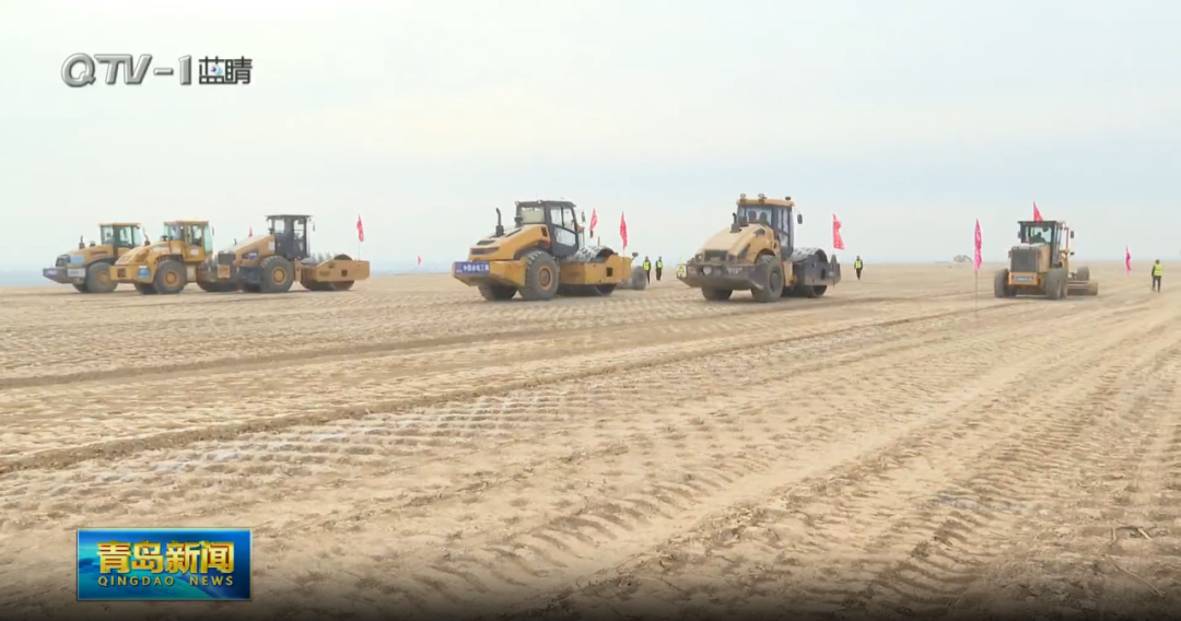 官路水库位于胶州市西北的墨水河下游,总占地2万多亩,设计总库容2.11亿立方米,围坝最大坝高24.40米。在宽70米的大坝上,7辆压路机一字排开、缓缓前行,进行围坝坝基碾压施工。